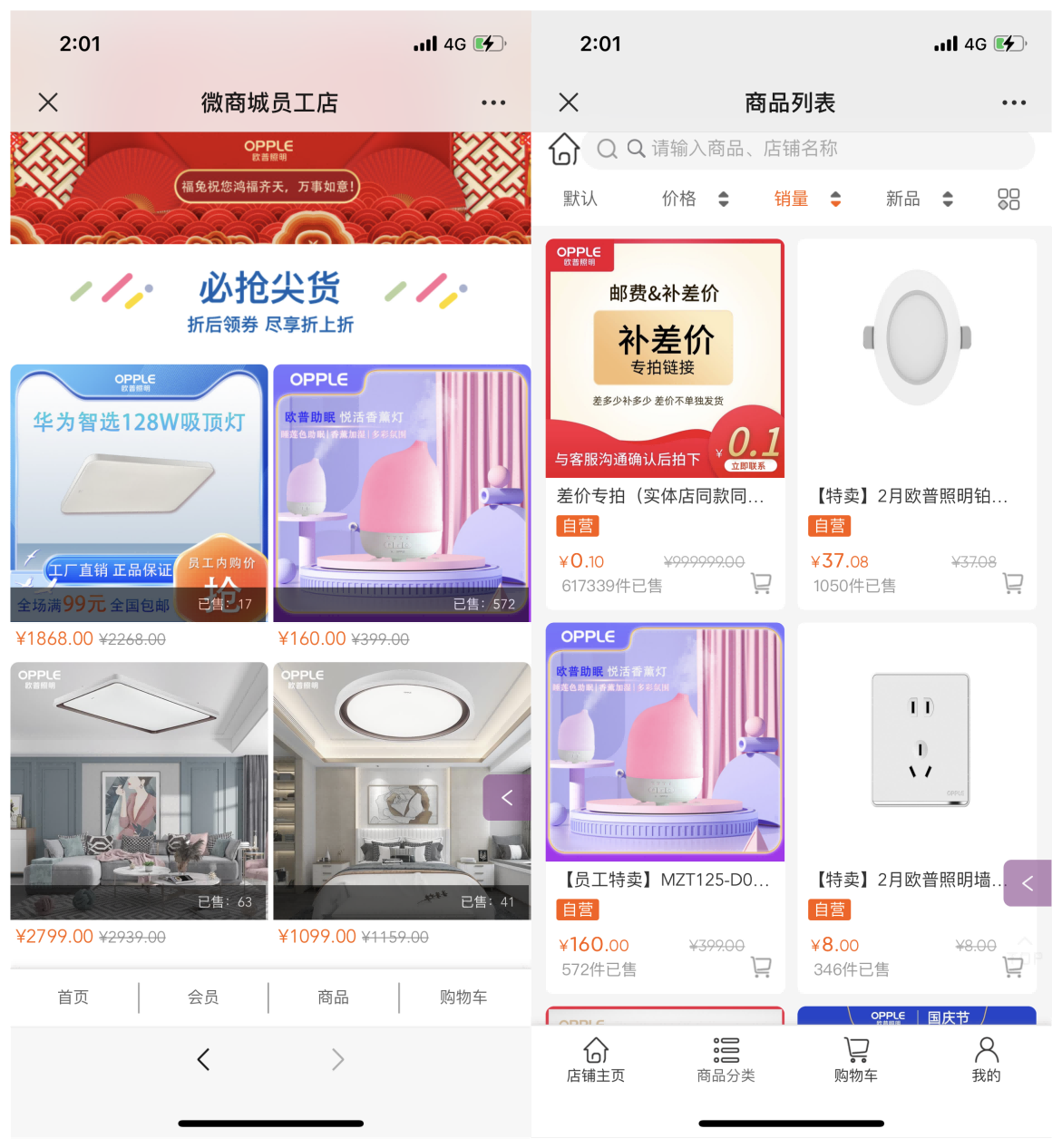 为了激活线上微商城的留存和复购,除了积分赠送、满减优惠之外,欧普还启动了门店导购分销的模式。店内导购只要分享、转发,促成交易即可赚取佣金。商品品质、发货、物流全权由总部负责,导购分销无需操心。